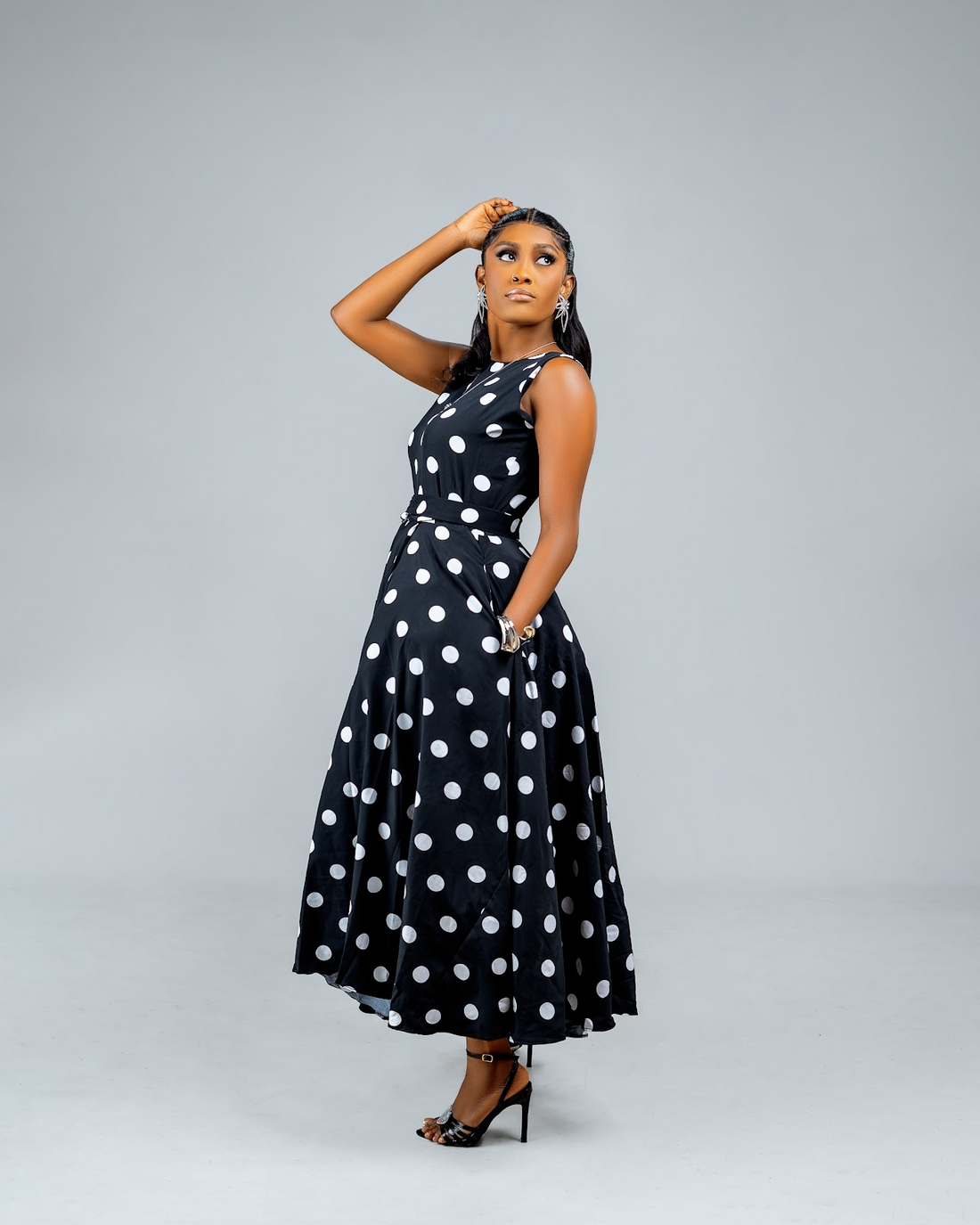 MIDI-LENGTH BLACK POLKADOT DRESS