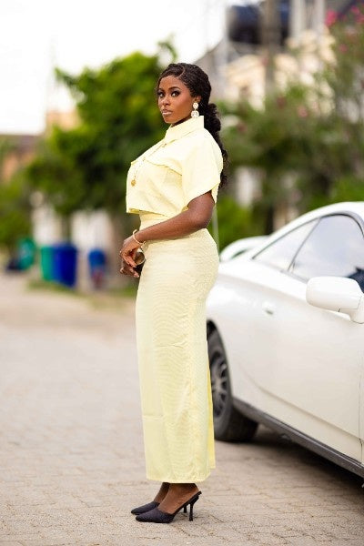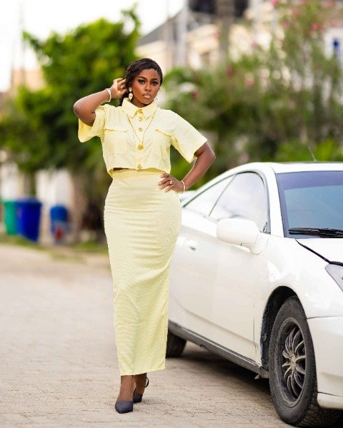 Radiate grace and poise with our Classy Chic Two-Piece Set, a perfect blend of elegance, structure, and subtle boldness. This stylish set includes a button-up cropped shirt with wide sleeves and a structured collar, paired with a figure-hugging high-waist maxi skirt that effortlessly accentuates your curves.
