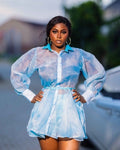 Cloud Muse Organza Dress, a show-stopping blend of softness, style, and subtle sensuality. Made from translucent ice-blue organza fabric, this set includes a long-sleeve button-down shirt and perfect for the fashion-forward woman who isn’t afraid to stand out.