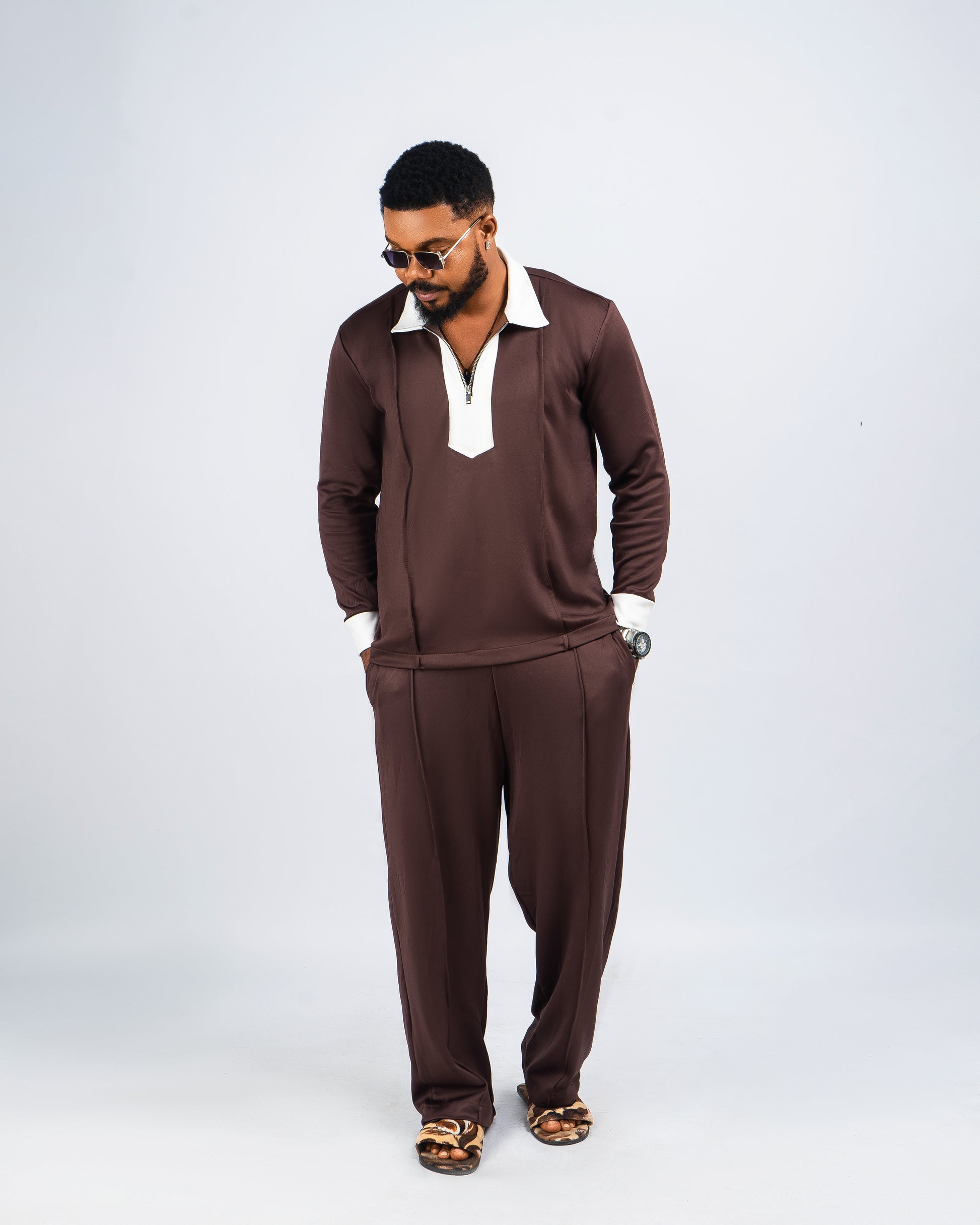This sophisticated tracksuit. Designed for a clean, contemporary look, the jacket features short sleeves and a subtle vertical seam detail leading to a black half-zip collar. The trousers maintain the clean line with a comfortable, straight fit. This lightweight set is perfect for making a bold, statement-making impression in warm weather.