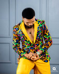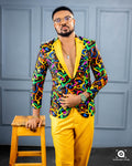 Step into the spotlight with our Vibrant Royale Multicolor Blazer Set, a statement piece tailored for the confident modern man. This striking single-breasted blazer features a bold explosion of multicolored heart and swirl patterns against a deep black background, paired with solid black trousers for a clean finish.