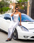 Crafted from high-quality stretchy fabric with a metallic sheen, this set offers unrestricted movement, a sculpted silhouette, and statement-worthy style. Whether you're heading to a night out, a celebration, or simply stepping into your power, this look commands attention.