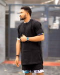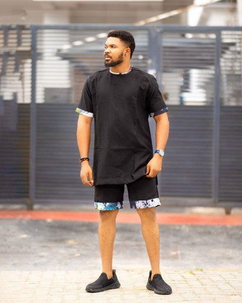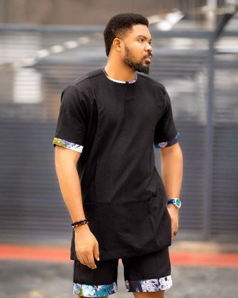 Define your style with our "Urban" Two-Piece Set for men. This sophisticated black ensemble features a comfortable tunic-style top with subtle patterned accents on the collar and sleeve cuffs, perfectly matched with shorts featuring a complementary patterned hem. Crafted for a modern, relaxed fit, this set is versatile enough for casual daywear, evening gatherings, or making a confident statement wherever you go.